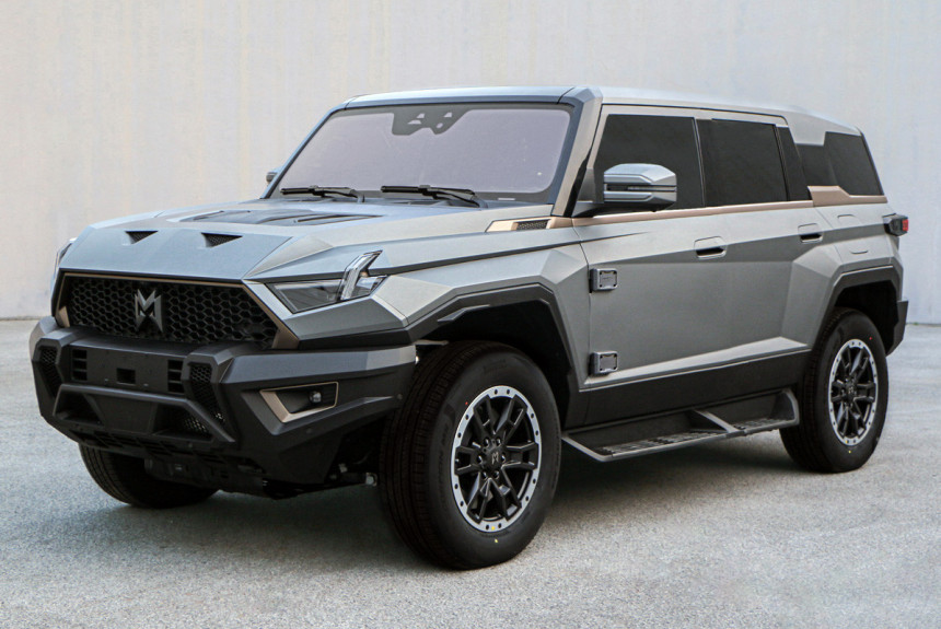 Брутальный внедорожник за 14,5 миллиона отличается угловатыми формами и оптикой с крестообразным рисунком. Интерьер выполнен в духе милитари: крупные сиденья, простые формы воздуховодов, массивные дверные ручки. В движение автомобиль приводит гибридная установка с тремя электромоторами и бензиновым движком в качестве генератора. Суммарная мощность всех компонентов составляет 816 л. с.